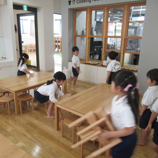 午睡から目覚めたお友達から、お着替えをしています。早く着替えたお友達は、「おやつの用意するね~!」と、机を拭いたり、椅子を並べてたり・・・