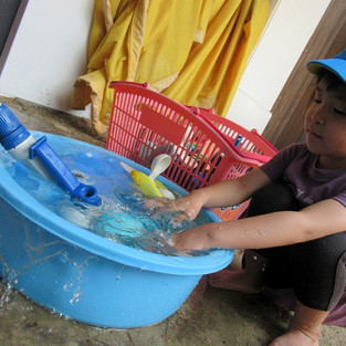 砂場用の玩具を水洗いしてくれているのは、はなめぐみのKちゃん😊 ひとつひとつ丁寧に洗ってくれました。