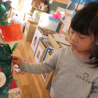 さて、このクリスマスツリー! 作っている間から、子ども達は気になって気になって仕方がなかったようで、「なにつくってるのー?」の声が、あちらこちらから聞こえてきていました😊 ようやく一番上まで完成すると、「クリスマスツリーだぁ」と気づき、大騒ぎ( *´艸`) 早速、飾りづくりに励んでいました❕❕