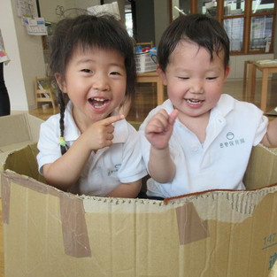 初めは、段ボール箱の中に入って遊んでいた子ども達でしたが、遊びを重ねる毎にいろいろな遊び方を考え出し、楽しむ姿が見られるようになりました。