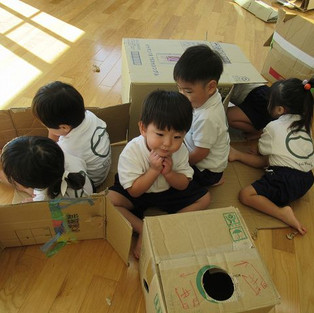 朝のおやつを食べた後の自由時間、子ども達は段ボール箱が置いてある所へ一目散に向かいます。