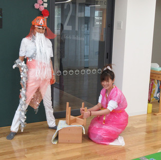 絵本の読み聞かせが始まるのかと思うと・・・ シュッとした,、とてもスタイルのいい神様の登場です!! 子ども達も、神様が登場するやいなや、大興奮!!💕「うわ~!!✨」