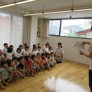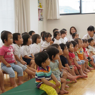 お集まりでは、真剣に先生の話を聞いて、今から何が始まるのか、ドキドキ💕ワクワク😊 まず、みんなで、「天の川の上で」「キラキラぼし」の歌を歌いました! 歌声もとても素敵✨ 七夕の話を聞いたり、先生の出し物を見て、楽しい時間を過ごしましたよ(^^♪