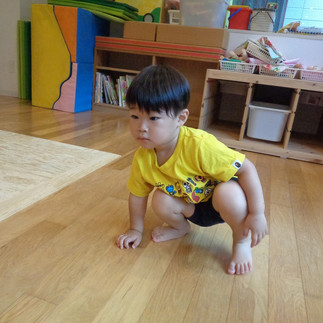 身の回りのことにも積極的に取り組む姿が見られてきたお友だちですが、ズボンを脱いだり履いたりできるようになってきました。