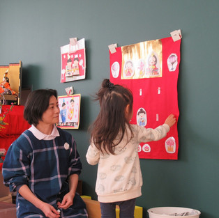 ひな人形が描かれた絵を取り、その場所に貼ることができるかゲームをしました。「どこかな~??」と、分からない時は、ひな壇をヒントに考えながら貼りました。