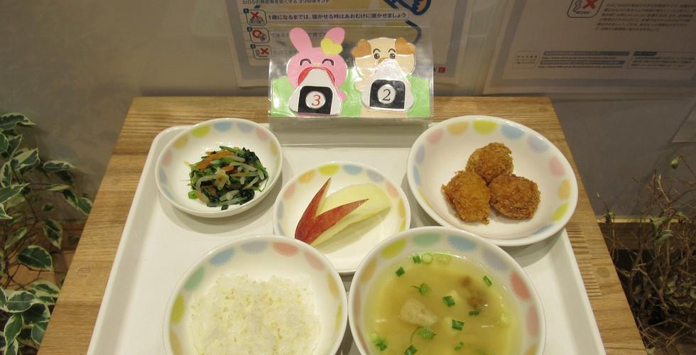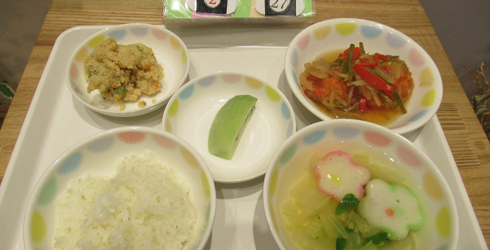 ・七分づき米 ・かぼちゃのコロッケ ・もやしの磯香和え ・果物(りんご)・みそ汁