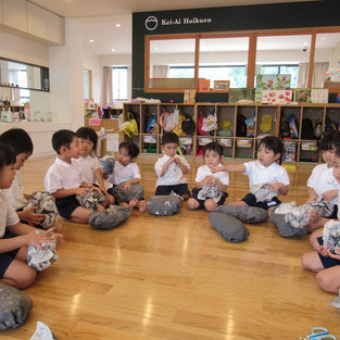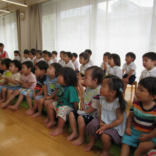 今の子ども達は、原爆の恐ろしさを知りません。子ども達にも分かりやすく、原爆の話を行い、「みんなで仲良く遊んだり、楽しく生活しようね!」と話し、平和の集いを行いました。