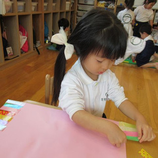 次に、はさみの1回切りで細い折り紙を半分に切り、模様をつけた画用紙の両側に貼ります✄