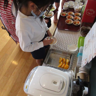 みのり組さんは、ランチルームでメインのおかずを盛りつけしています。