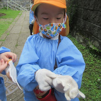 4月当初はなかなか軍手をつけられず、苦戦したり、保育者に手伝ってもらうこともありましたが、少しずつ自分でつけられるようになってきました。
