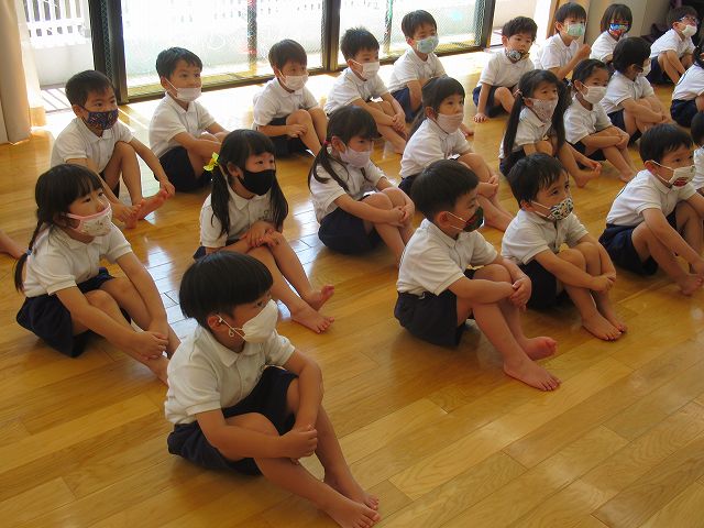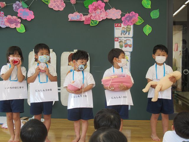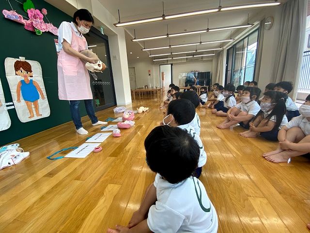 6月10日(木)、当園の助産師/看護師による“からだの話”があり、つぼみ組さん(3歳児)とはなめ組さん(4歳児)がお話を聞きました。